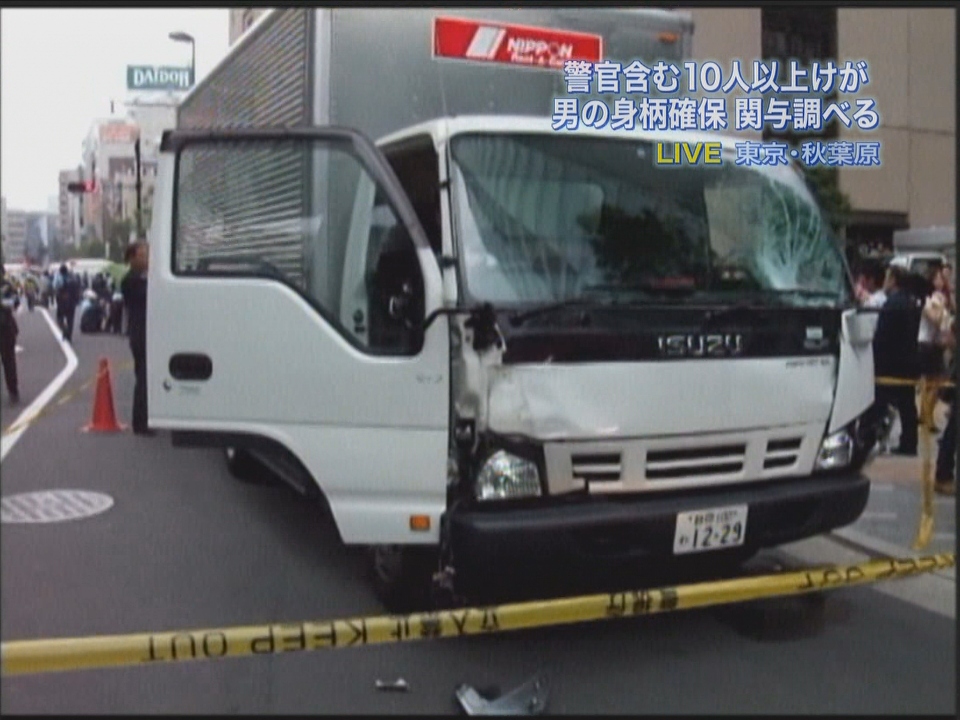 これが犯人:加藤智大(ともひろ)容疑者(25)写真です。 ●秋葉原で通行人ら次々刺され、5人が心肺停止状態[2008/06/08] 8日午後零時半ごろ、東京都千代田区外神田4の秋葉原電気街の中心部で、男が刃物ようなものを振り回し、通行人を次々と刺した。男は身柄を確保された。 東京消防庁によると、けが人は10人以上とみられ、刺された6人のうち5人が心肺停止状態だという。現場には救急車17台が出動し対応に当たっている。 目撃者らの話によると、最初に歩行者天国にトラックが突っ込み、7、8人をはねて止まった。その後、運転していたとみられる男が通行人らを次々と刺したという。 ●秋葉原で通行人ら次々刺され、5人が心肺停止状態[産経新聞] アキバでテロ発生!緊急メモ! 現地に居なかったのでなんともいえませんが。 毎週、居るのに偶然居ない。 これは、運がいいのか?悪いのか? っていうか、テロリストが居るんじゃ武装てアキバに行かないと身をまもれんな。 というよりも、アキバがテロの目的地になっているのが問題なのである。 しかも、表通りの交差点。かなり人が多く。車で入れる交差点です。 ●秋葉原通り魔事件 25歳男を逮捕 「暴力団員」と名乗る 東京・秋葉原で8日昼に起きた連続殺傷事件で、警視庁万世橋署は同日、殺人未遂の現行犯で、住所・職業不詳、加藤智大(ともひろ)容疑者(25)を逮捕した。調べに対し、暴力団員だと名乗っているという。 ●秋葉原で男が通行人や警察官17人を車ではねて刺す 3人死亡 8日午後0時35分ごろ、東京都千代田区外神田のJR秋葉原駅近くの秋葉原電気街の交差点で、男が赤信号を無視してトラックで突っ込み、通行人ら5~6人をはねた。さらに男は車から降りて、買い物客らをサバイバルナイフのようなもので次々と切りつけた。警視庁万世橋署と東京消防庁によると、制止しようとした警察官や通行人ら男女17人がけがを負って病院に搬送されたが、19歳と47歳、74歳の男性3人が死亡、2人が心肺停止状態だという。男はその場で殺人未遂の現行犯で取り押さえられた。 男は青森県出身で静岡県裾野市、職業不詳、加藤智大容疑者(25)。暴力団組員を名乗っており、「通行人を刺しました」と話しているという。警視庁は無差別殺人事件として万世橋署に捜査本部を設置した。 これまでの調べによると、トラックは2トンのレンタカー。目撃情報などによると、加藤容疑者はジグザグ走行しながら交差点内に侵入、信号待ちの車を追い抜く形で交差点に進入して次々と横断者をはねたとみられる。 その後、持参していたサバイバルナイフで買い物客らを刺すなどしたほか、制止しようとしたパトロール中の万世橋署交通課の男性警部補にも切りかかったという。けが人は判明しているだけで男性10人、女性3人。 現場は秋葉原駅から数十メートルの中央通りと神田明神通りの交差点。中央通りは日曜日で歩行者天国となっており、買い物客らで混雑しており、騒然となった。 目撃した男性(20)は「ものすごい悲鳴を上げて男が走りながら刺していった。怖くなって逃げるので必死だった」と声を震わせていた。 ●秋葉原通り魔、別の刃物も所持 過去30年で最悪の被害か 東京・秋葉原の電気街で8日午後、赤信号を無視して突っ込んできたトラックに横断者がはねられ、降りてきた運転手に通行人がサバイバルナイフで次々と刺された事件で、殺人未遂容疑で現行犯逮捕された加藤智大容疑者(25)が、犯行に使われたナイフのほかに、もう1本別の刃物を所持していたことが、警視庁捜査1課と万世橋署の調べで分かった。 関係者によると、加藤容疑者は昨年11月に製造業派遣大手の日研総業に登録、静岡県内の自動車部品工場に派遣され働いていたという。 ◎犯人と思われる写真:ベージュのスーツは合ってるが金髪は? ◎現場の写真1 被害者?犯人?どっちだ? 犯人は金髪だそうです。ああっDQNか。 ◎現場のヘリ写真 ◎犯人が使用した車。ここだよ!現場! このトラックじゃどうしようもない。。 ◎MIXIで犯行予告か? 画像に全部入れてあります。炎上前に魚拓したよ。 男は25歳で加藤と名乗っているそうです! テロ朝のテロップじゃ加藤智大(25) これでFAだろうか? スーツ姿で30代ぐらいでメガネ。 ん?これ・・・あのカメコか?っておもったんだが、 いま完全に埋まってる。交差点全てが封鎖されている。 いま、アキバに行けば現場みれますが。 まだ、犯人関連の仲間が残ってそうだ。 キチガイは一人じゃない! カメコに学ぶ犯罪学。キチガイは一人じゃない。 っていうか、荷物検査を強制的にやっても車で突撃されたら何も出来ん。 錯綜してる情報:まとめ。 ・けが14人うち5人が心肺停止 ←現在7名死亡 ・ゲハ板で犯行声明 http://namidame.2ch.net/test/read.cgi/ghard/1211823579/ ・静岡ナンバーの車で場所は駅から150mの交差点。ソフマップ前交差点突撃。数人をはねる ・20cmサバイバルナイフで刺して回る ・自称25歳の暴力団員 ←ハッタリ ・車から奇声を上げて切りかかる ・動機不明 ←精神異常で人生に疲れ果