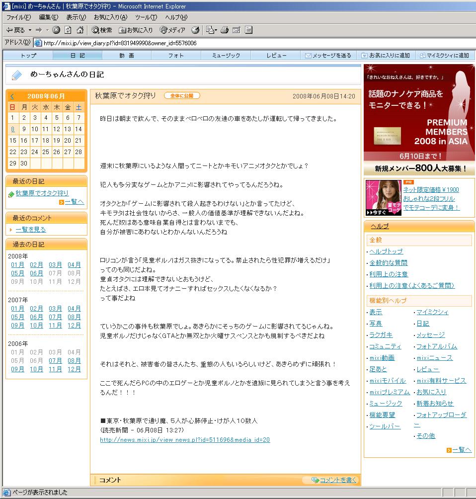とうとう、mixiから殺人報告をした馬鹿がでてきました。