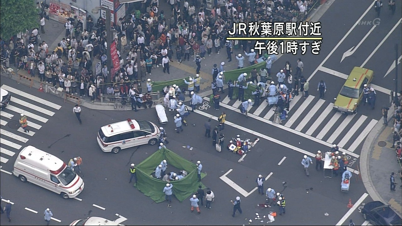 これが犯人:加藤智大(ともひろ)容疑者(25)写真です。 ●秋葉原で通行人ら次々刺され、5人が心肺停止状態[2008/06/08] 8日午後零時半ごろ、東京都千代田区外神田4の秋葉原電気街の中心部で、男が刃物ようなものを振り回し、通行人を次々と刺した。男は身柄を確保された。 東京消防庁によると、けが人は10人以上とみられ、刺された6人のうち5人が心肺停止状態だという。現場には救急車17台が出動し対応に当たっている。 目撃者らの話によると、最初に歩行者天国にトラックが突っ込み、7、8人をはねて止まった。その後、運転していたとみられる男が通行人らを次々と刺したという。 ●秋葉原で通行人ら次々刺され、5人が心肺停止状態[産経新聞] アキバでテロ発生!緊急メモ! 現地に居なかったのでなんともいえませんが。 毎週、居るのに偶然居ない。 これは、運がいいのか?悪いのか? っていうか、テロリストが居るんじゃ武装てアキバに行かないと身をまもれんな。 というよりも、アキバがテロの目的地になっているのが問題なのである。 しかも、表通りの交差点。かなり人が多く。車で入れる交差点です。 ●秋葉原通り魔事件 25歳男を逮捕 「暴力団員」と名乗る 東京・秋葉原で8日昼に起きた連続殺傷事件で、警視庁万世橋署は同日、殺人未遂の現行犯で、住所・職業不詳、加藤智大(ともひろ)容疑者(25)を逮捕した。調べに対し、暴力団員だと名乗っているという。 ●秋葉原で男が通行人や警察官17人を車ではねて刺す 3人死亡 8日午後0時35分ごろ、東京都千代田区外神田のJR秋葉原駅近くの秋葉原電気街の交差点で、男が赤信号を無視してトラックで突っ込み、通行人ら5~6人をはねた。さらに男は車から降りて、買い物客らをサバイバルナイフのようなもので次々と切りつけた。警視庁万世橋署と東京消防庁によると、制止しようとした警察官や通行人ら男女17人がけがを負って病院に搬送されたが、19歳と47歳、74歳の男性3人が死亡、2人が心肺停止状態だという。男はその場で殺人未遂の現行犯で取り押さえられた。 男は青森県出身で静岡県裾野市、職業不詳、加藤智大容疑者(25)。暴力団組員を名乗っており、「通行人を刺しました」と話しているという。警視庁は無差別殺人事件として万世橋署に捜査本部を設置した。 これまでの調べによると、トラックは2トンのレンタカー。目撃情報などによると、加藤容疑者はジグザグ走行しながら交差点内に侵入、信号待ちの車を追い抜く形で交差点に進入して次々と横断者をはねたとみられる。 その後、持参していたサバイバルナイフで買い物客らを刺すなどしたほか、制止しようとしたパトロール中の万世橋署交通課の男性警部補にも切りかかったという。けが人は判明しているだけで男性10人、女性3人。 現場は秋葉原駅から数十メートルの中央通りと神田明神通りの交差点。中央通りは日曜日で歩行者天国となっており、買い物客らで混雑しており、騒然となった。 目撃した男性(20)は「ものすごい悲鳴を上げて男が走りながら刺していった。怖くなって逃げるので必死だった」と声を震わせていた。 ●秋葉原通り魔、別の刃物も所持 過去30年で最悪の被害か 東京・秋葉原の電気街で8日午後、赤信号を無視して突っ込んできたトラックに横断者がはねられ、降りてきた運転手に通行人がサバイバルナイフで次々と刺された事件で、殺人未遂容疑で現行犯逮捕された加藤智大容疑者(25)が、犯行に使われたナイフのほかに、もう1本別の刃物を所持していたことが、警視庁捜査1課と万世橋署の調べで分かった。 関係者によると、加藤容疑者は昨年11月に製造業派遣大手の日研総業に登録、静岡県内の自動車部品工場に派遣され働いていたという。 ◎犯人と思われる写真:ベージュのスーツは合ってるが金髪は? ◎現場の写真1 被害者?犯人?どっちだ? 犯人は金髪だそうです。ああっDQNか。 ◎現場のヘリ写真 ◎犯人が使用した車。ここだよ!現場! このトラックじゃどうしようもない。。 ◎MIXIで犯行予告か? 画像に全部入れてあります。炎上前に魚拓したよ。 男は25歳で加藤と名乗っているそうです! テロ朝のテロップじゃ加藤智大(25) これでFAだろうか? スーツ姿で30代ぐらいでメガネ。 ん?これ・・・あのカメコか?っておもったんだが、 いま完全に埋まってる。交差点全てが封鎖されている。 いま、アキバに行けば現場みれますが。 まだ、犯人関連の仲間が残ってそうだ。 キチガイは一人じゃない! カメコに学ぶ犯罪学。キチガイは一人じゃない。 っていうか、荷物検査を強制的にやっても車で突撃されたら何も出来ん。 錯綜してる情報:まとめ。 ・けが14人うち5人が心肺停止 ←現在7名死亡 ・ゲハ板で犯行声明 http://namidame.2ch.net/test/read.cgi/ghard/1211823579/ ・静岡ナンバーの車で場所は駅から150mの交差点。ソフマップ前交差点突撃。数人をはねる ・20cmサバイバルナイフで刺して回る ・自称25歳の暴力団員 ←ハッタリ ・車から奇声を上げて切りかかる ・動機不明 ←精神異常で人生に疲れ果